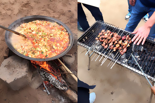 临近中午时组织野炊和烧烤,大家一起动手,有的升火添柴做菜,有的扇风烧炭、有的涂料抹粉,烧烤美味小吃。不一会儿,各种美味小吃和一锅香喷喷的烩菜端了出来,大家就在苍翠的树林里席地而坐,共进午餐,欢声笑语,其乐融融。